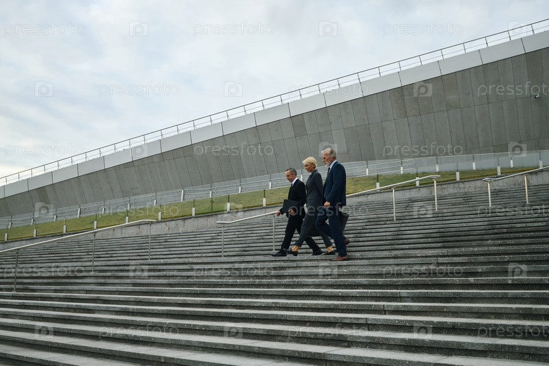 Профессионалы среднего возраста, идущие вниз по трем ступеням на открытом воздухе