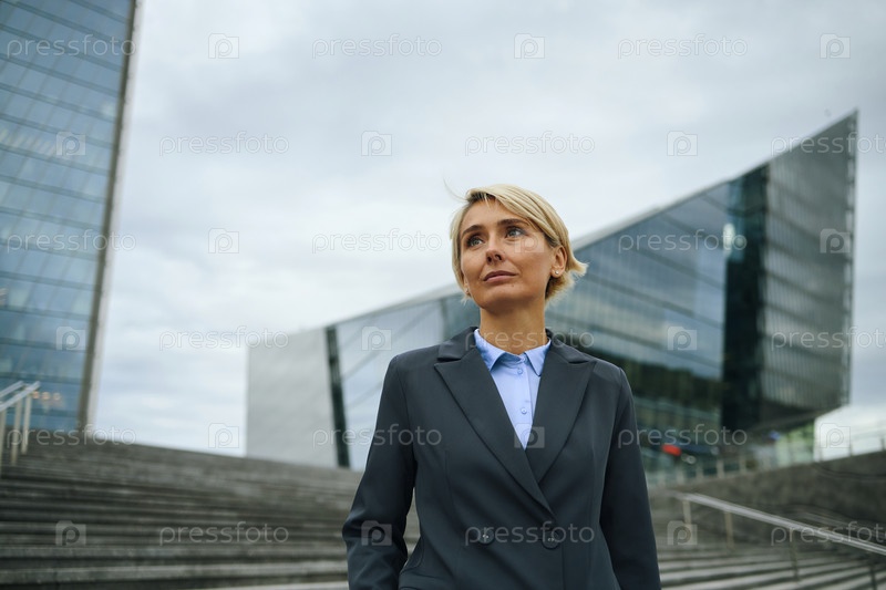 Деловая женщина, стоящая на открытом воздухе возле современных офисных зданий