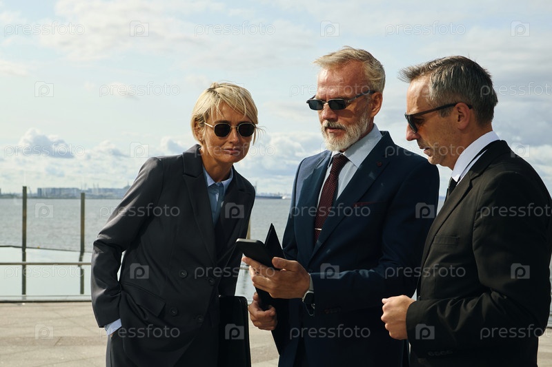 Три бизнес-профессионала со смартфоном обсуждают проект на открытом воздухе
