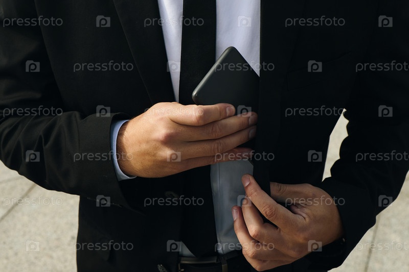 Молодой бизнесмен помещает смартфон внутрь костюма куртка карманная сумочка на улице