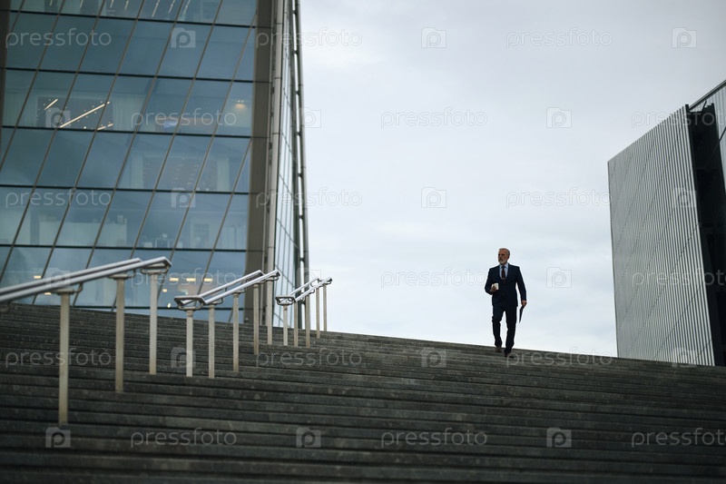Старший бизнесмен ходит наверх снаружи современного офисного здания