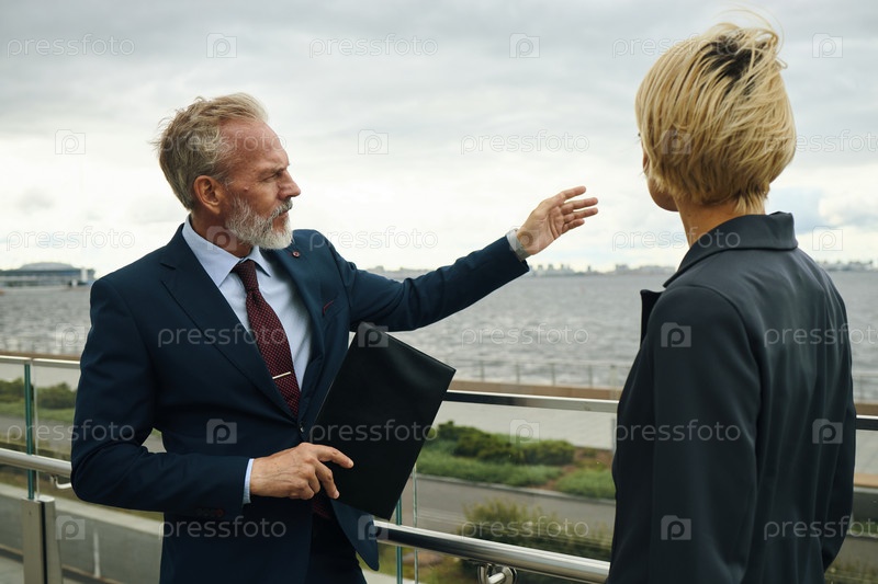 Зрелый бизнесмен жестикулирует, разговаривая с коллегой-женщиной на набережной