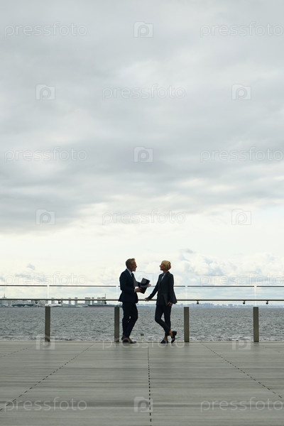 Зрелые мужчины и женщины бизнес-партнеры разговаривают на прогулке в гавани