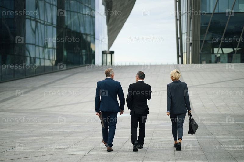 Группа бизнес-профессионалов в костюмах, ходящих по корпоративному офису