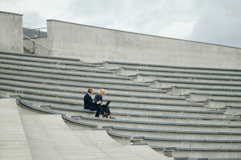 Бизнесмен и бизнесвумен обсуждают проект по бетонным ступеням на открытом воздухе