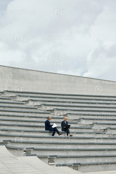 Мужчина и женщина средних лет обсуждают бизнес на уличных ступеньках