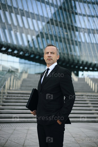 Мужчина средних лет уверенно стоит за пределами современного офисного здания