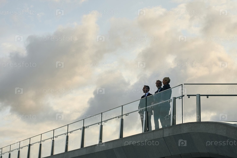 Три бизнесмена, стоящие на открытом мосту в сумерках