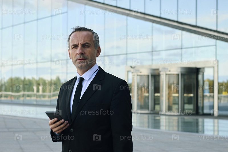 Портрет мужчины среднего возраста, стоящего снаружи офисного здания и держащего смартфон