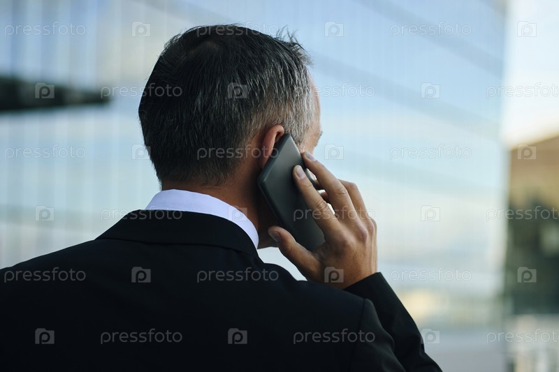 Задний вид бизнесмена, совершающего телефонный звонок за пределами современного стеклянного здания
