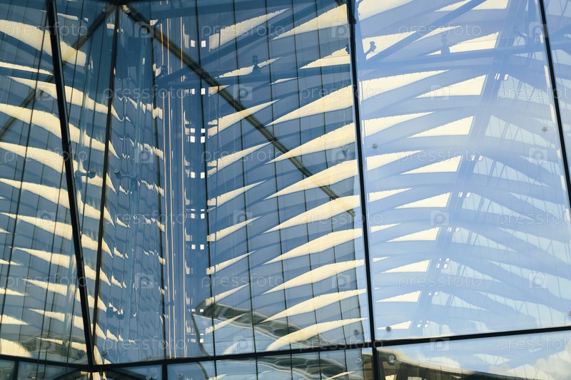 Современный архитектурный стеклянный фасад отражает геометрическую структуру потолка