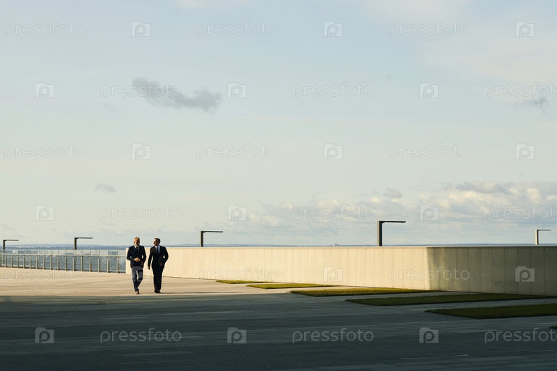 Два зрелых бизнесмена гуляют на открытом воздухе вдоль современной городской прогулки