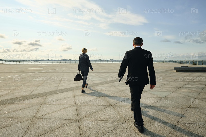Бизнесмен и бизнесвумен ходят по просторной площади на берегу моря