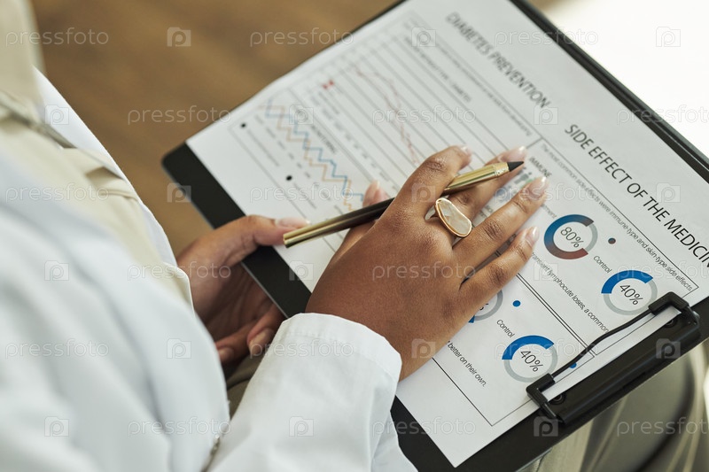 Чернокожая женщина среднего возраста анализирует медицинский график со статистикой диабета
