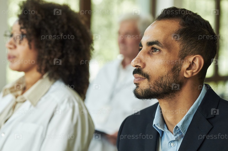 Молодой ближневосточный мужчина внимательно слушает во время бизнес-семинара