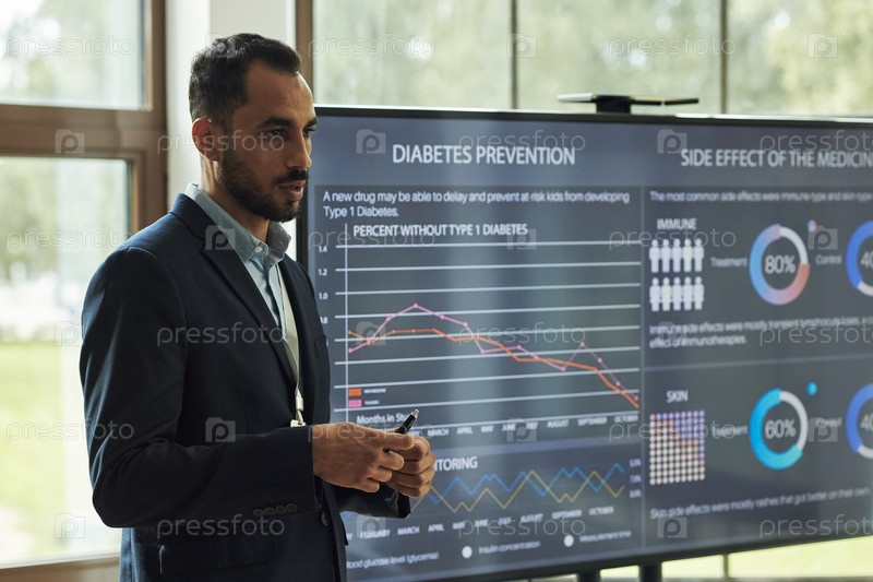 Молодой человек представляет данные о профилактике диабета во время медицинского семинара