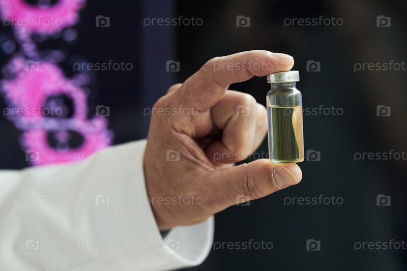 Мужчина, держащий медицинскую флаконку рукой в лабораторной среде