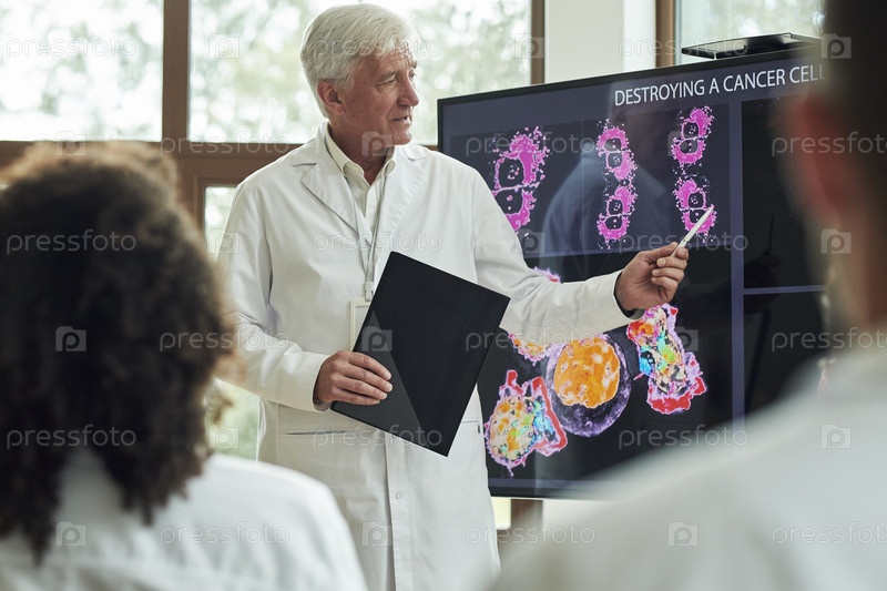 Старший мужчина объясняет уничтожение раковых клеток студентам-медикам
