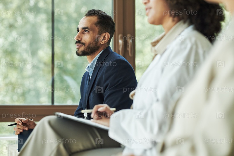 Молодой полиэтнический мужчина внимательно слушает во время деловой встречи в помещении