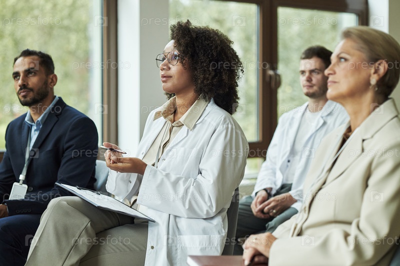 Разнообразная группа медицинских специалистов, посещающих семинар в конференц-зале