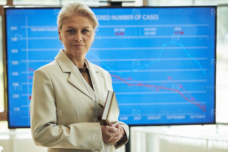Руководитель женской клиники, уверенно стоящая перед диаграммой медицинских данных