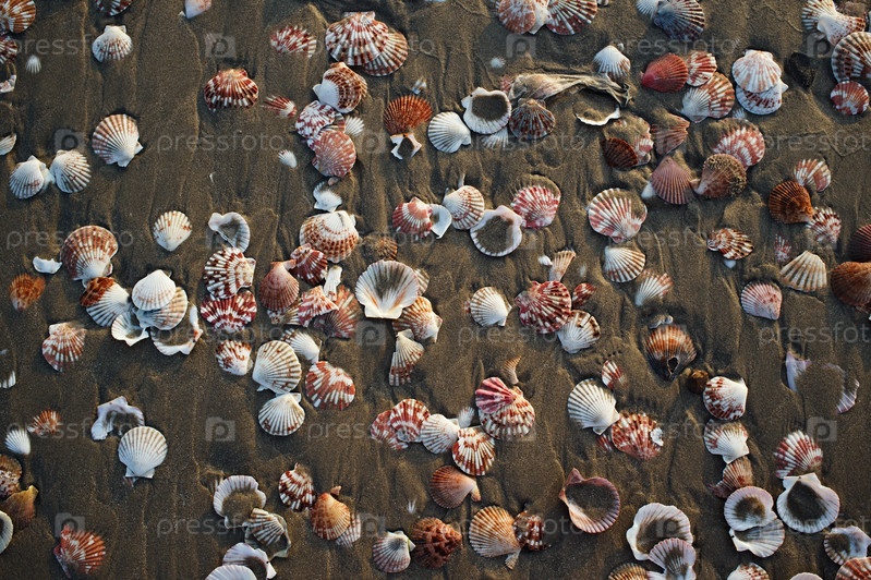 Прямо сверху вид на несколько раковинных моллюсков, лежащих на влажном песке у берега моря