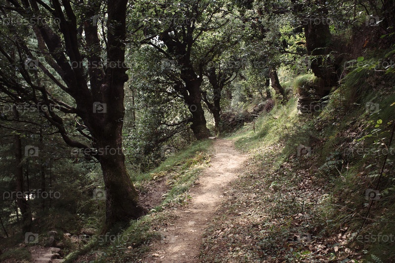 Прекрасный вид на узкую тропу, освещенную солнечным светом и ведущую через густой зеленый лес