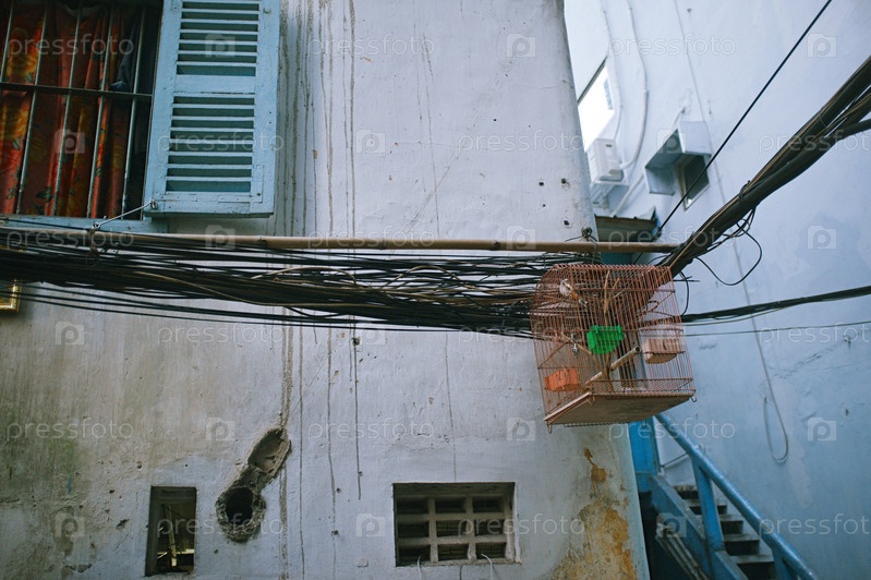 Клетка с маленькой птицей, висящей рядом со многими запутанными электрическими проводами и белым хрупким домом с решетками на окне