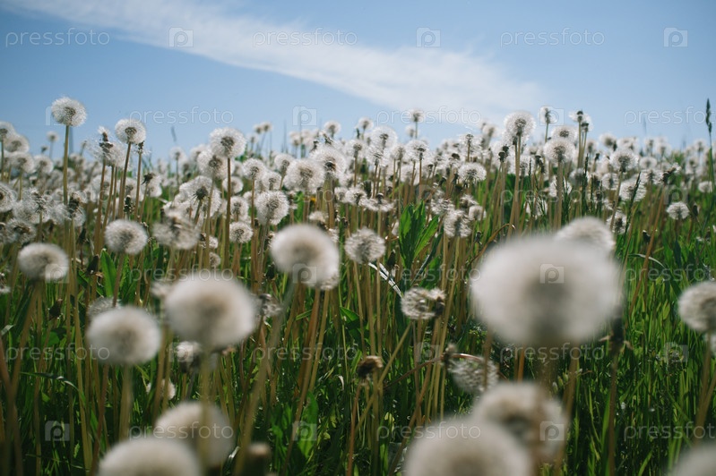 Близкий вид на красивое поле одуванчиков в яркий солнечный день, размытые цветы на переднем плане