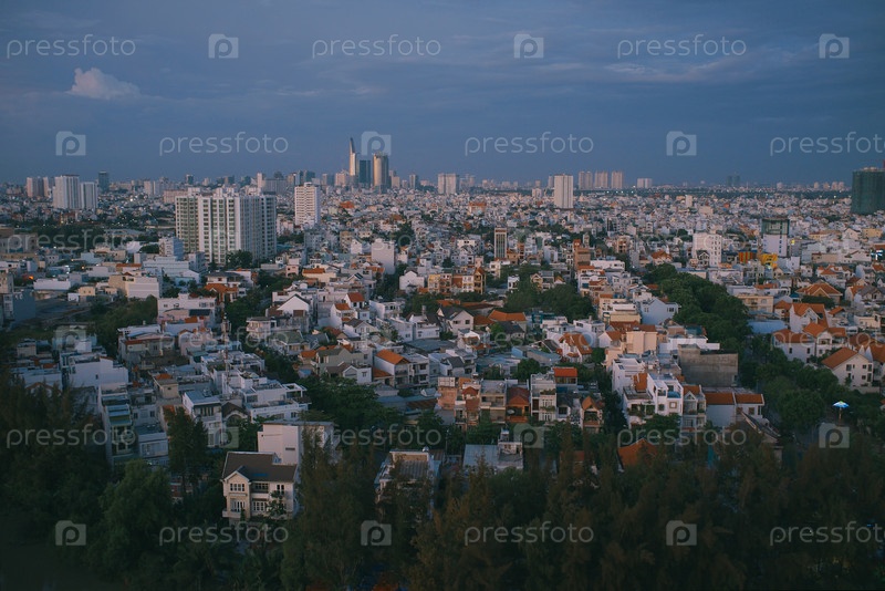 Панорамный вид на небольшие дома и многоквартирные здания в зеленом уютном пригороде города Хошимин при закате солнца, Вьетнам