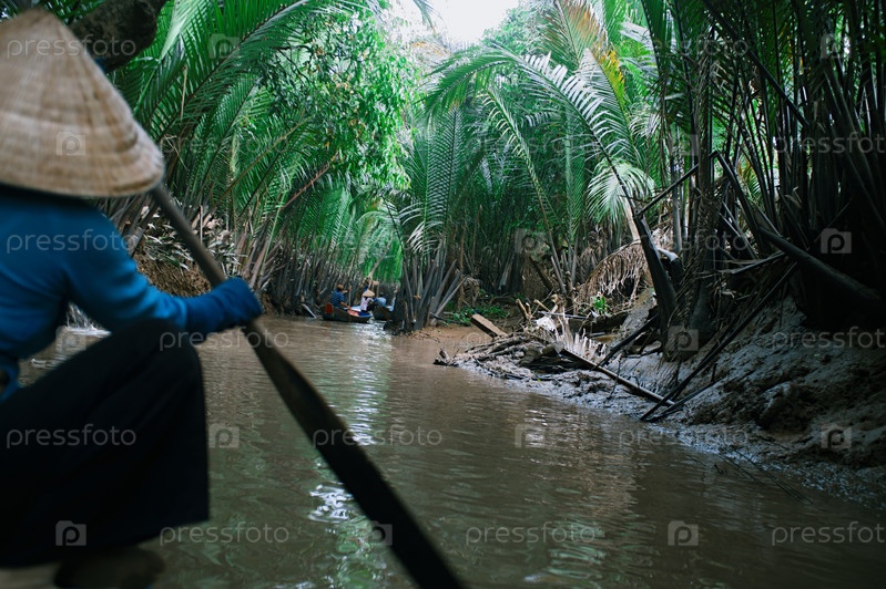 Мой То, Вьетнам - 25 января 2014 года: Человек гребёт традиционной лодкой в дельте Меконга