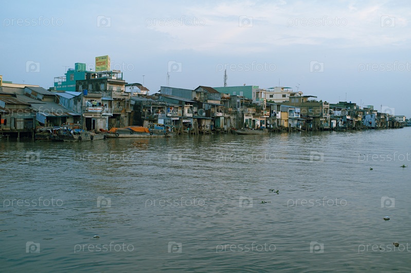 Мой То, Вьетнам - 25 января 2014 года: Дома на берегу реки в рыбацкой деревне