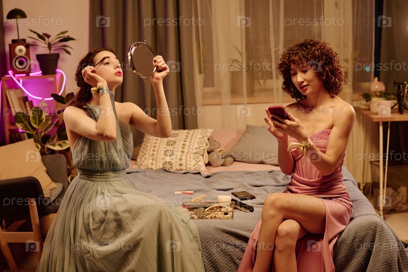 Две молодые взрослые женщины готовятся и наносят макияж в помещении