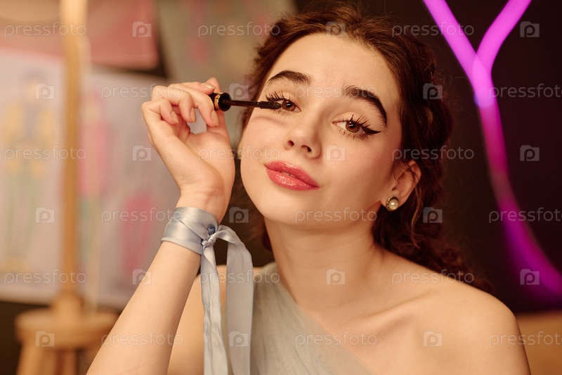 Портрет девочки-подростка, наносящей маскару, глядя в камеру