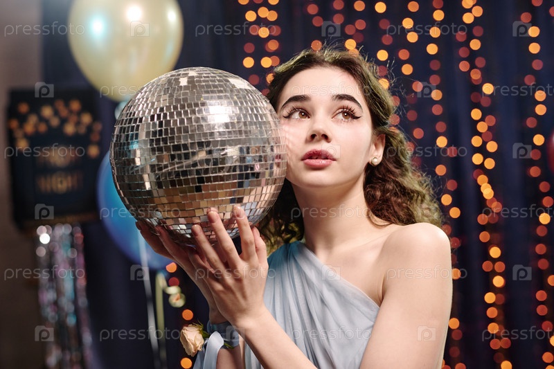 Портрет девочки-подростка, держащей дискотечный мяч на выпускном вечере