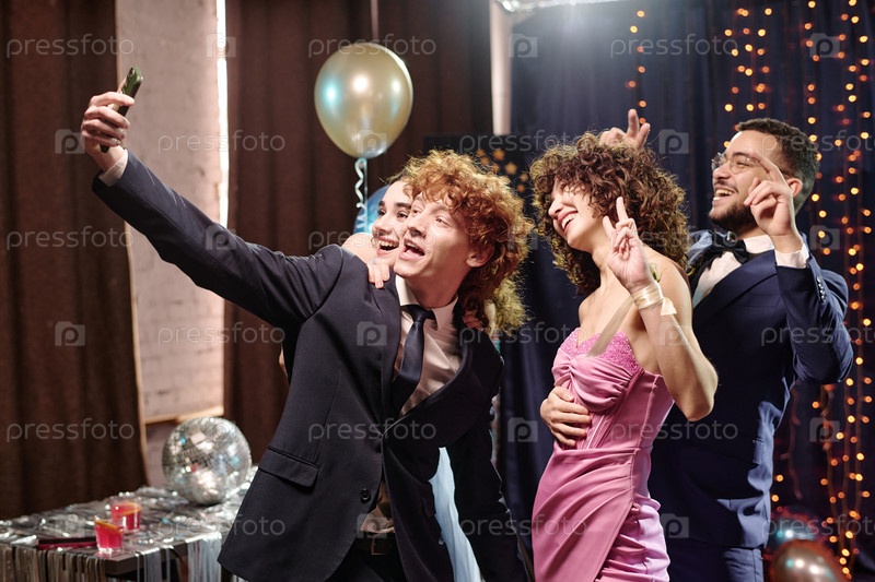 Группа друзей-молодых взрослых, которые делают селфи и празднуют на вечеринке в помещении