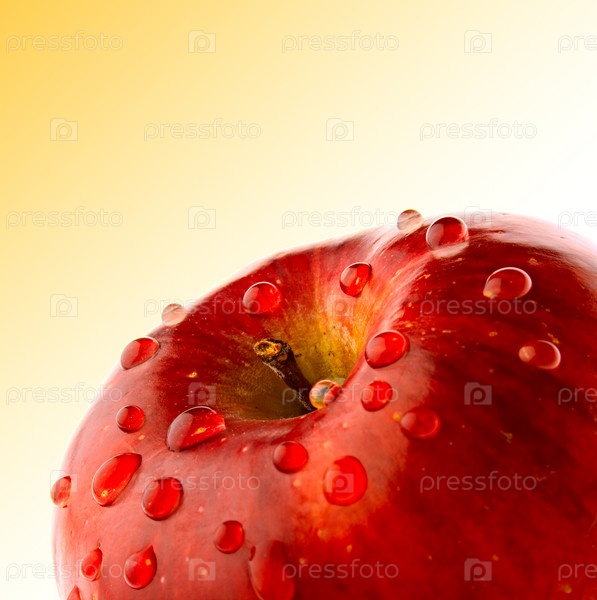 Красное яблоко в капле росы изолировано на желтом фоне