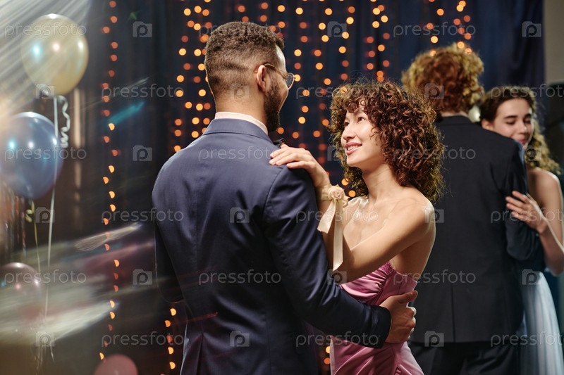 Молодая женщина танцует с молодым человеком на торжественном мероприятии