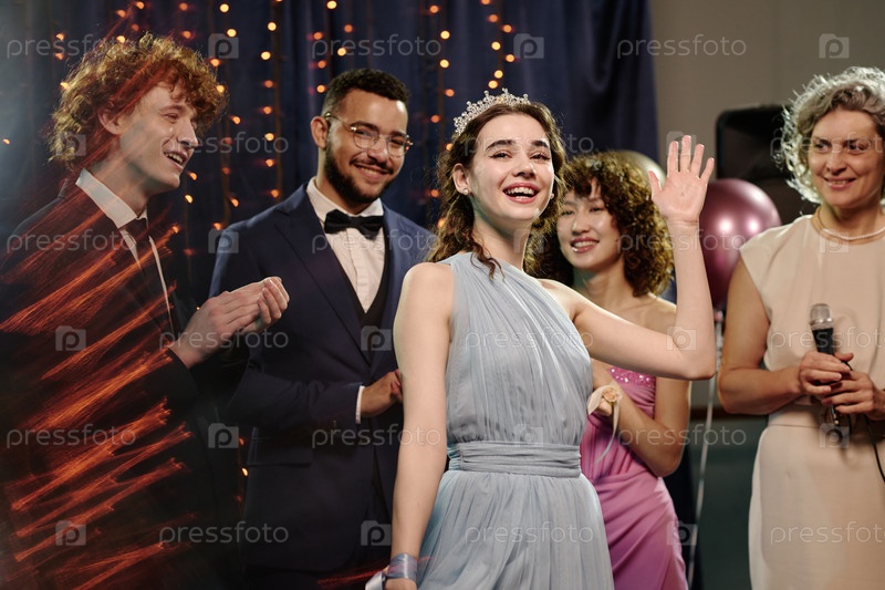 Подростковая девушка улыбается и машет в окружении разных друзей на вечеринке