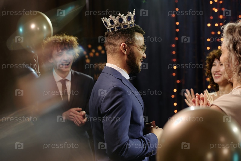 Молодой взрослый мужчина, носящий корону, празднует вечер выпускного с друзьями