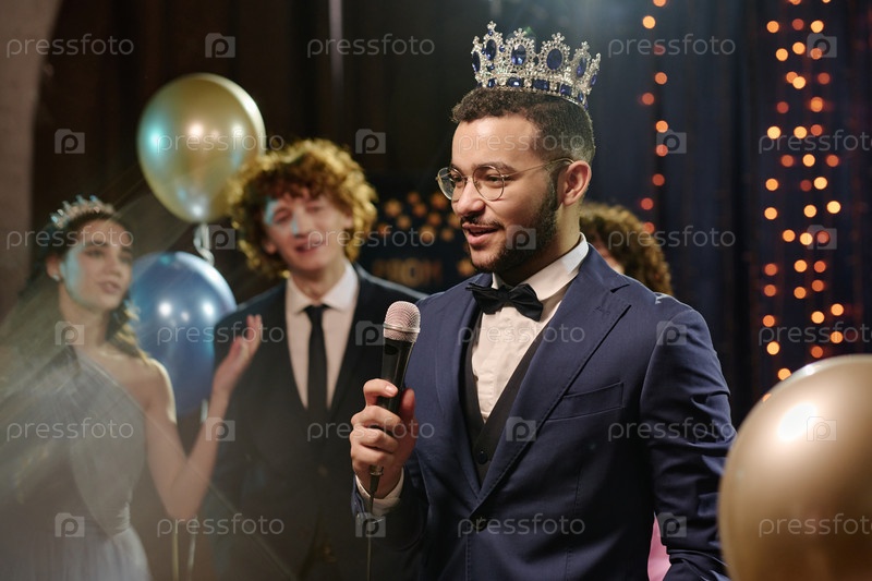 Молодой взрослый мужчина, носящий корону, говорит в микрофон на вечеринке