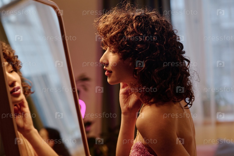Молодая взрослая женщина восхищается отражением, стоя рядом со зеркалом