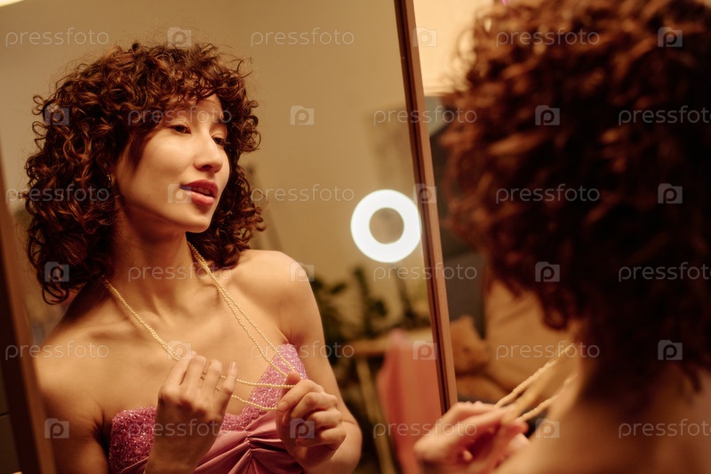 Молодая взрослая женщина восхищается ожерельем, глядя на себя в зеркало