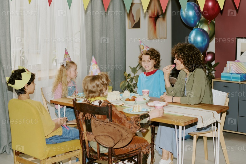 Группа детей и молодых взрослых женщин, празднующих день рождения в помещении