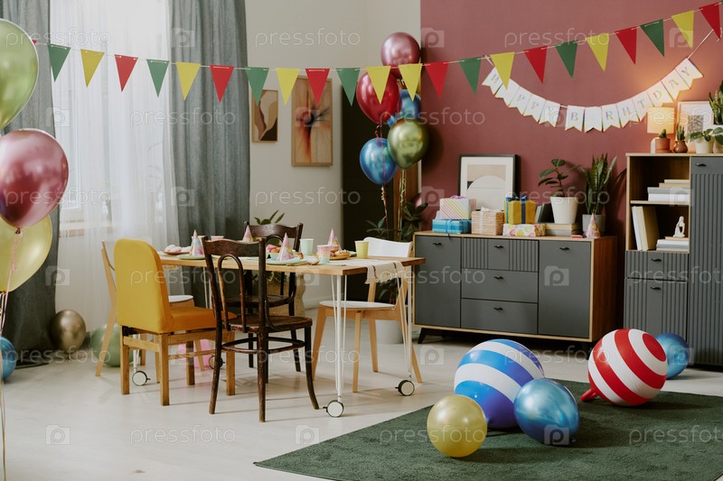 Пустая комната для вечеринки по случаю дня рождения, украшенная воздушными шарами и праздничным столовым укладкой