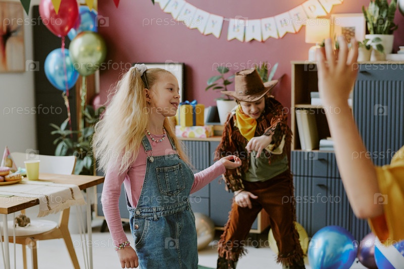 Девушка танцует, пока подросток мальчик в ковбойском костюме развлекают гостей
