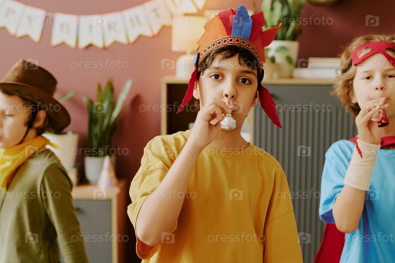 Портрет многонациональных детей, празднующих день рождения в костюмах вечеринки