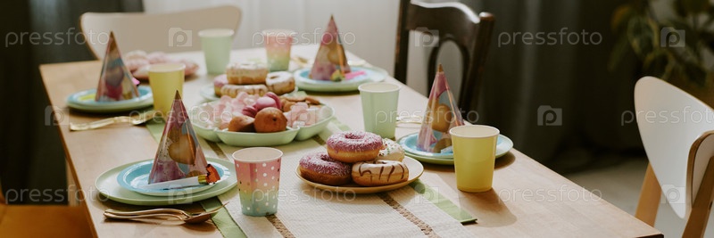 Красочная столовая установка на день рождения с партийными шляпами и сладкими пирожками