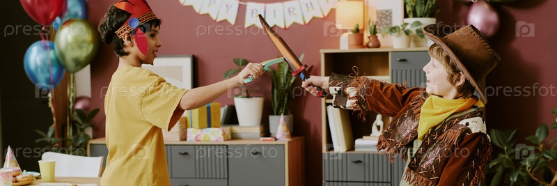 Два юноши в костюмах притворяются, что сражаются мечом на вечеринке по случаю дня рождения