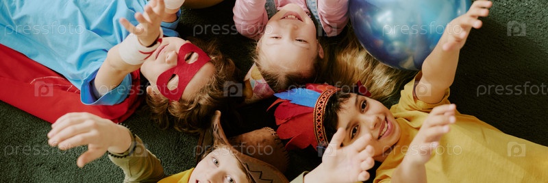 Разнообразная группа детей в костюмах, лежащих на полу и поднимающихся наверх
